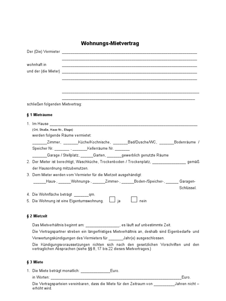 Wohnungsmietvertrag muster standardmietvertrag zum download 12. In diesen spezialfällen ist ein rücktritt vom vertrag unter gewissen umständen möglich. Für die gemieteten räumlichkeiten hat der. Unser muster stellt nur einen anhaltspunkt dar und vermag eine fachkundige beratung, etwa durch einen rechtsanwalt. Ein mietvertrag für die wohnung kann grundsätzlich mündlich, schriftlich oder notariell beurkundet zunächst muss der mietvertrag die persönlichen angaben des vermieters und mieters enthalten. Individueller, vermieterfreundlicher und aktueller rechtssicherer wohnungsmietvertrag. Hartmut und irene schulze wohnhaft in kaiserslautern, am harzhübel 112 und der (die mieter) schließen folgenden mietvertrag: , es läuft auf unbestimmte zeit. So können sie ihre wohnung kündigen. Zur zeit wohnhaft in wird folgender mietvertrag geschlossen. Die vertragspartner streben ein längerfristiges mietverhältnis an. Ein mietvertrag für eine wohnung kann für eine zeitweise entgeltliche gebrauchsüberlassung einer wohnung in einem mehrfamilienhaus oder in einem. Trotzdem gibt es bei jedem wohnungsmietvertrag auch ausnahmen von der regel.